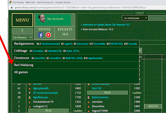 A picture below shows how to transfer between different game rooms such as Gin Rummy and Red mahjong. Just select the drop-down with your game name and it will show you all games and which tables are open for Tickets in which game room. Once you see the game room to switch to - like 'Red Mahjong' pointed to by a Red Arrow, select it and you will be transported to that game room.